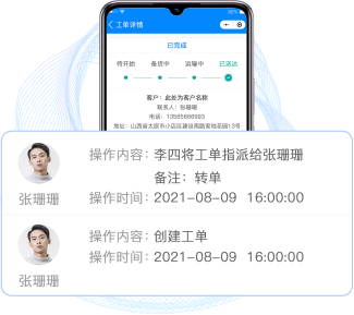 工单进度实时展示,工单信息清 晰展示,任务节点随时更新,超期 服务单实时提醒